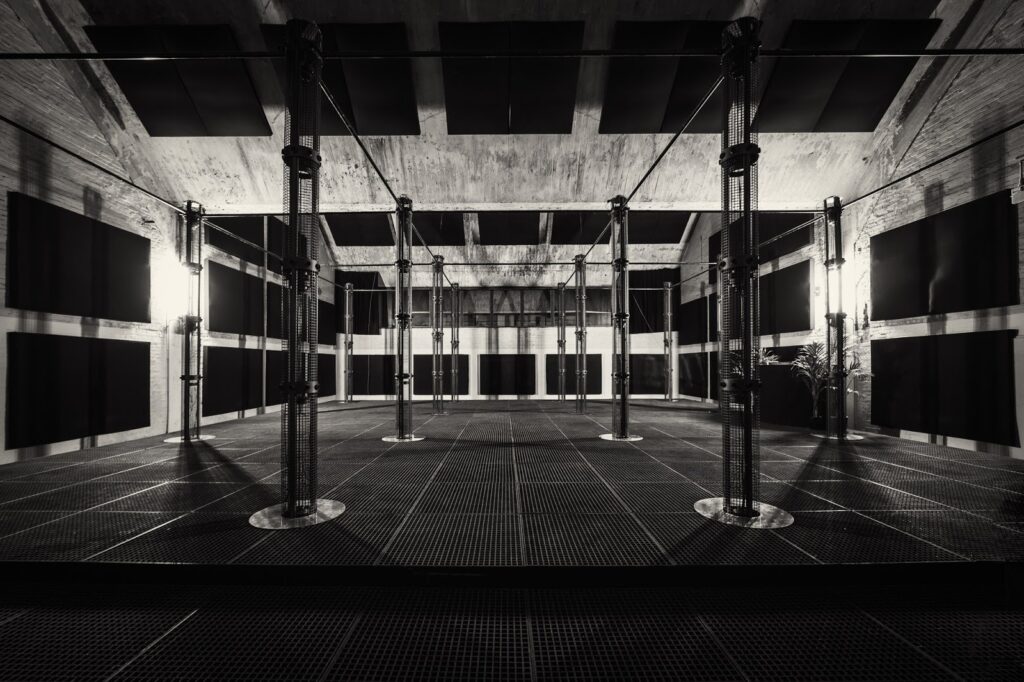 Mis primeros acercamientos a esto se dieron cuando trabajé junto a Monom en Berlín. Este estudio trabaja con la tecnología 4DSOUND y un sistema de parlantes omnidireccionales. Realizamos instalaciones en lugares poco convencionales como fábricas en desuso, palacios de la realeza y uno que en definitiva me inspiró a investigar más sobre el fenómeno acústico. El “halle am Berghain” que es un espacio anexo al famoso club techno de Berlín, utilizado para eventos de arte, exposiciones, conciertos e instalaciones, no para la fiesta regular del club, aprovechando su arquitectura industrial única para experiencias sonoras y visuales que fusiona música, arte y tecnología. Es un lugar donde la atmósfera industrial brutalista se convierte en un «organismo acústico», ofreciendo una experiencia cultural diferente a la de las pistas de baile principales.