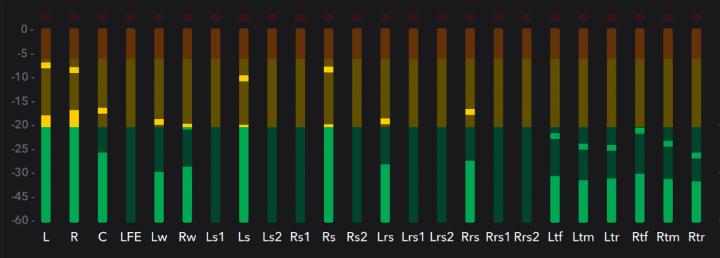 Otra desventaja, es la traducción a salas de Cine y estudios que utilizan “arrays” de parlantes en su configuración, ya que en en estos escenarios, las señales del bed se reproducen a través de varios parlantes, esto con el fin de abarcar mayor espacio, y que la audiencia tenga la mejor experiencia posible, sobre todo en salas muy grandes.